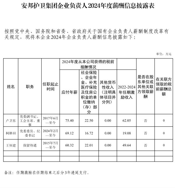安邦护卫集团企业负责人2024年度薪酬信息披露表