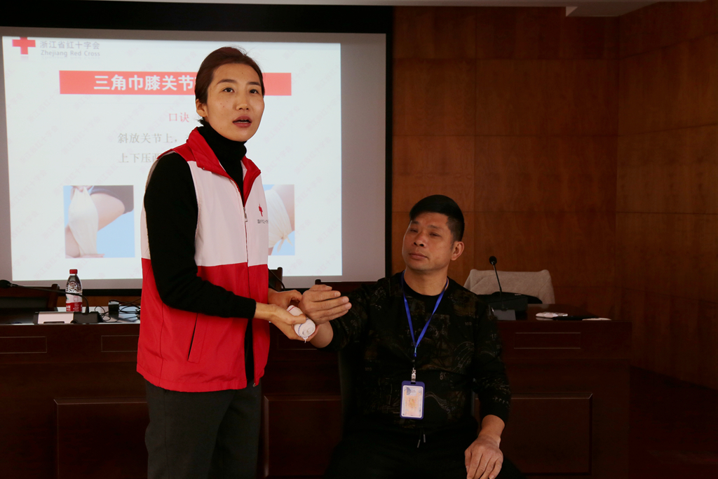 培训分为授课和考试两部分。培训老师为大家详细讲解了水、火、电事故的急救处理和心肺复苏、气道梗塞急救、创伤救护、AED(自动体外除颤器)使用与操作,并通过生动具体的实例和现场演示,让受训人员迅速掌握知识要点。培训老师的专业、生动的讲解和精湛的救护技术深深地吸引了在场的每一位学员。