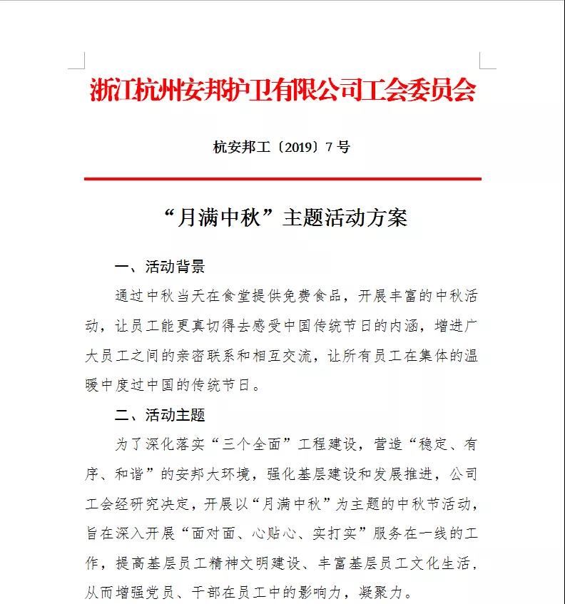 为了深化落实“三个全面”工程建设,营造“稳定、有序、和谐”的安邦大环境,强化基层建设和发展推进,公司工会经研究决定,开展以“月满中秋”为主题的中秋节活动,各基地分工会自行设计活动项目(茶会、游戏,座谈会等活动),在相聚之余,畅谈工作和生活,以体恤员工为前提,增加团队凝聚力为目的,促进安邦队伍稳定健康成长。