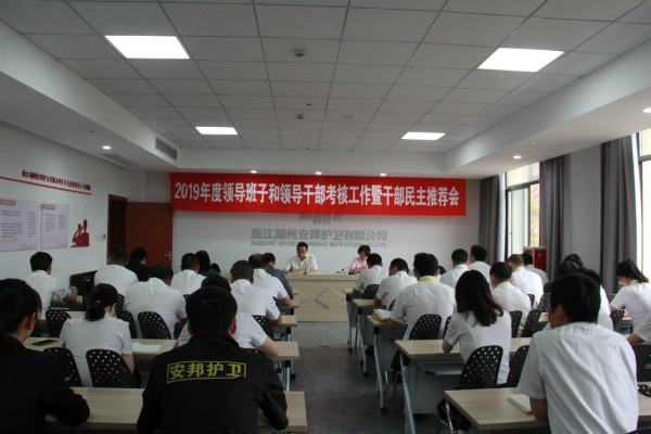 根据集团公司党委《关于做好2019年度子公司领导班子和领导干部年度考核工作的通知》要求,5月22日上午,湖州安邦护卫公司召开2019年度领导班子和领导干部考核工作暨干部民主推荐会。会议由公司党委书记、董事长、总经理莫继权同志主持,公司党委班子、中层干部及行政人员参加会议,集团公司组织人事部部长王萍等一行四人到会参加考核和推荐。