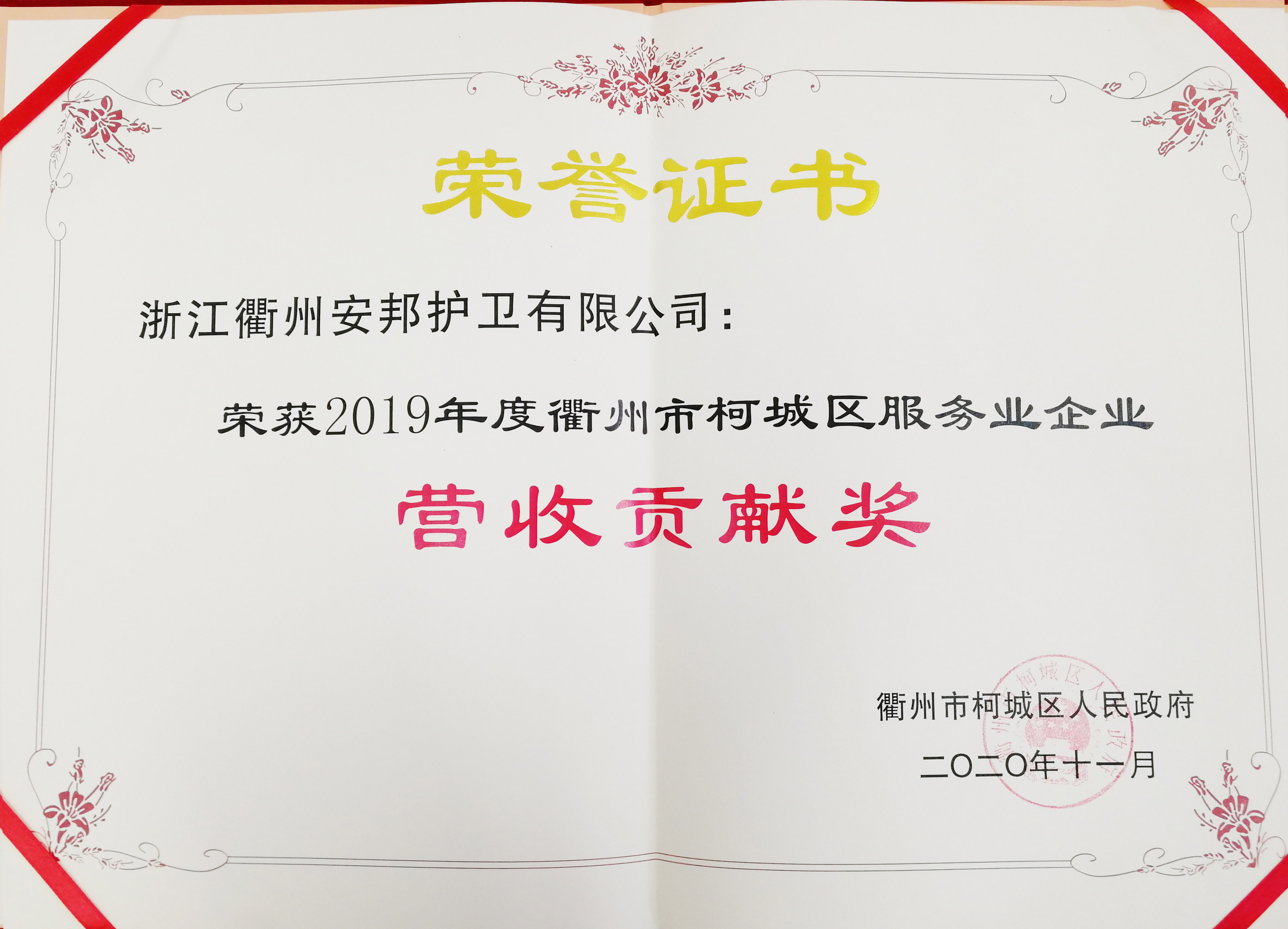 衢州安邦护卫喜获“2019年度衢州市柯城区服务业企业营收贡献奖”