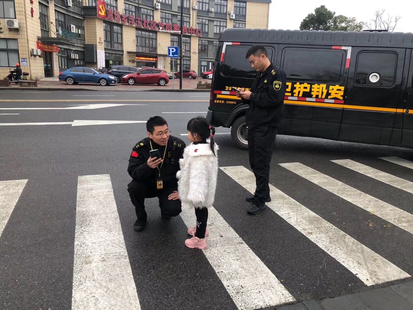 12月19日上午9时左右,浙江湖州安邦护卫有限公司员工刘志文、鲁海斌在执行任务至月河小学浮玉校区附近时,发现一名小女孩正独自来回穿梭在马路中间,路上车辆来来往往非常危险。