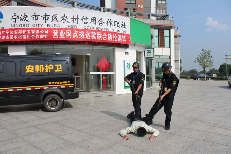 9月26日下午,在宁波市公安局治安支队支持配合下,公司与市区信用联社联合在该行应嘉丽园支行,以防止歹徒在款箱到达网点装卸时进行持械劫为主题,开展了应急预案演练,市公安局治安支队保安监管大队大队长陈炎军、市区信用联社安全保卫部总经理胡文亮、市保安协会办公室副主任吴倩倩等一行6人到场观摩。