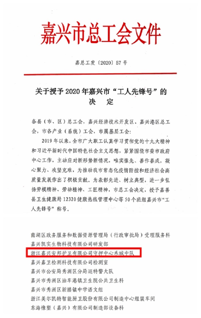今天,嘉兴安邦护卫公司获悉一个重大喜讯——公司守押中心禾城中队被嘉兴市总工会授予嘉兴市“工人先锋号”称号。表彰他们紧紧围绕嘉兴市委市政府中心工作,主动应对新形势新情况,唯实惟先、善作善成,凝心聚力、攻坚克难,为推动常态化疫情防控和经济社会高质量发展作出积极贡献。