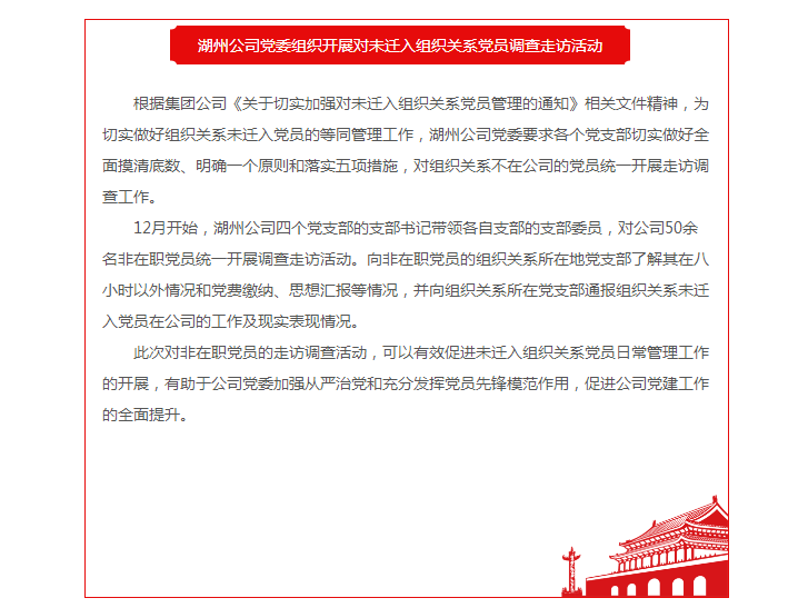 湖州公司党委组织开展对未迁入组织关系党员调查走访活动