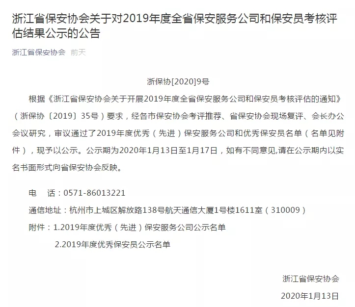 浙江衢州安邦保安服务有限公司被浙江省保安协会评为“2019年度优秀保安服务公司”。