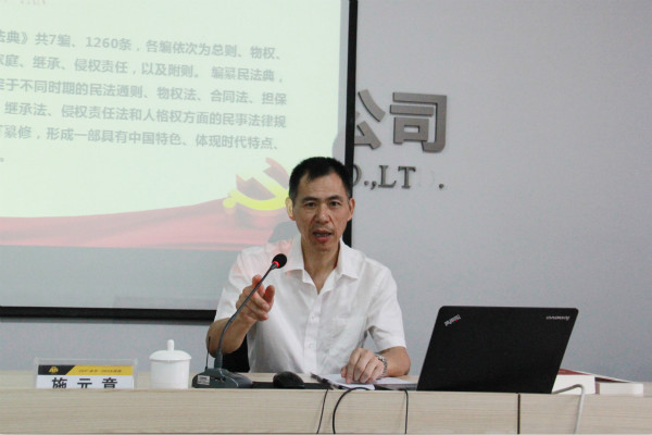 为深入贯彻落实党的十九大和十九届二中、三中、四中全会精神,贯彻落实习近平总书记关于颁布实施民法典的重要讲话精神,9月10日,湖州公司特邀浙江汉本律师事务所执业律师施元章、徐磊峰为公司开展《民法典》专题讲座,公司领导、各部门、大队、中队(中心)负责人以及行政副主管级以上人员参加了培训。