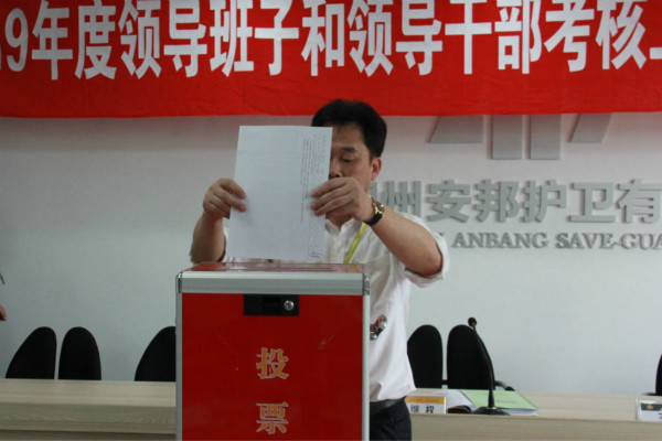 根据集团公司党委《关于做好2019年度子公司领导班子和领导干部年度考核工作的通知》要求,5月22日上午,湖州安邦护卫公司召开2019年度领导班子和领导干部考核工作暨干部民主推荐会。会议由公司党委书记、董事长、总经理莫继权同志主持,公司党委班子、中层干部及行政人员参加会议,集团公司组织人事部部长王萍等一行四人到会参加考核和推荐。