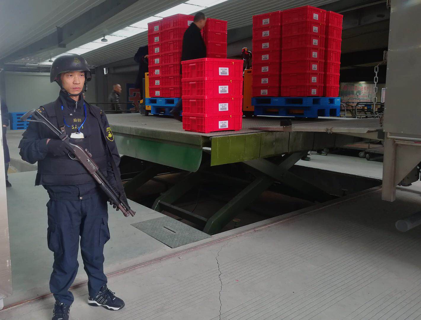 嘉兴安邦公司二期金库是在去年10月26日通过安防验收后正式投入使用,二期金库在建造初期就考虑到春节期间现金流转量大,人行出入库次数多的问题。为此,公司特地在金库一、二期平台的连接处,建成了一个30m²的液压升降平台,能对接包括人民银行在内各类大小型运钞车的机械化作业,为实现运钞全机械化操作,降低人工成本,奠定了扎实基础。