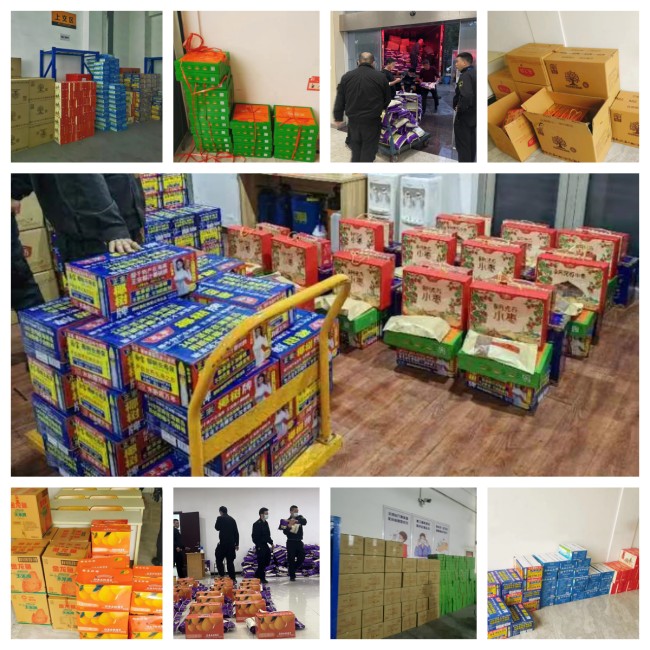 发放现场,有的人在分箱搬运,有的人在登记发放,大家肩抗手提,你来我往,场面非常热闹,上下洋溢着一片和谐温暖的喜庆氛围。