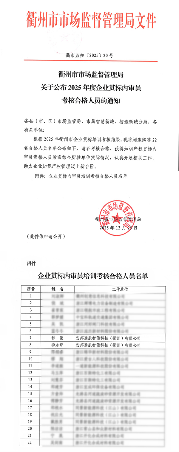 近日,衢州市市场监督管理局公布了2025年度企业贯标内审员考核合格人员名单,安邦通航智能科技(衢州)有限公司韩俊、李永奇双双通过考核,获“知识产权贯标内审员”资格证书。