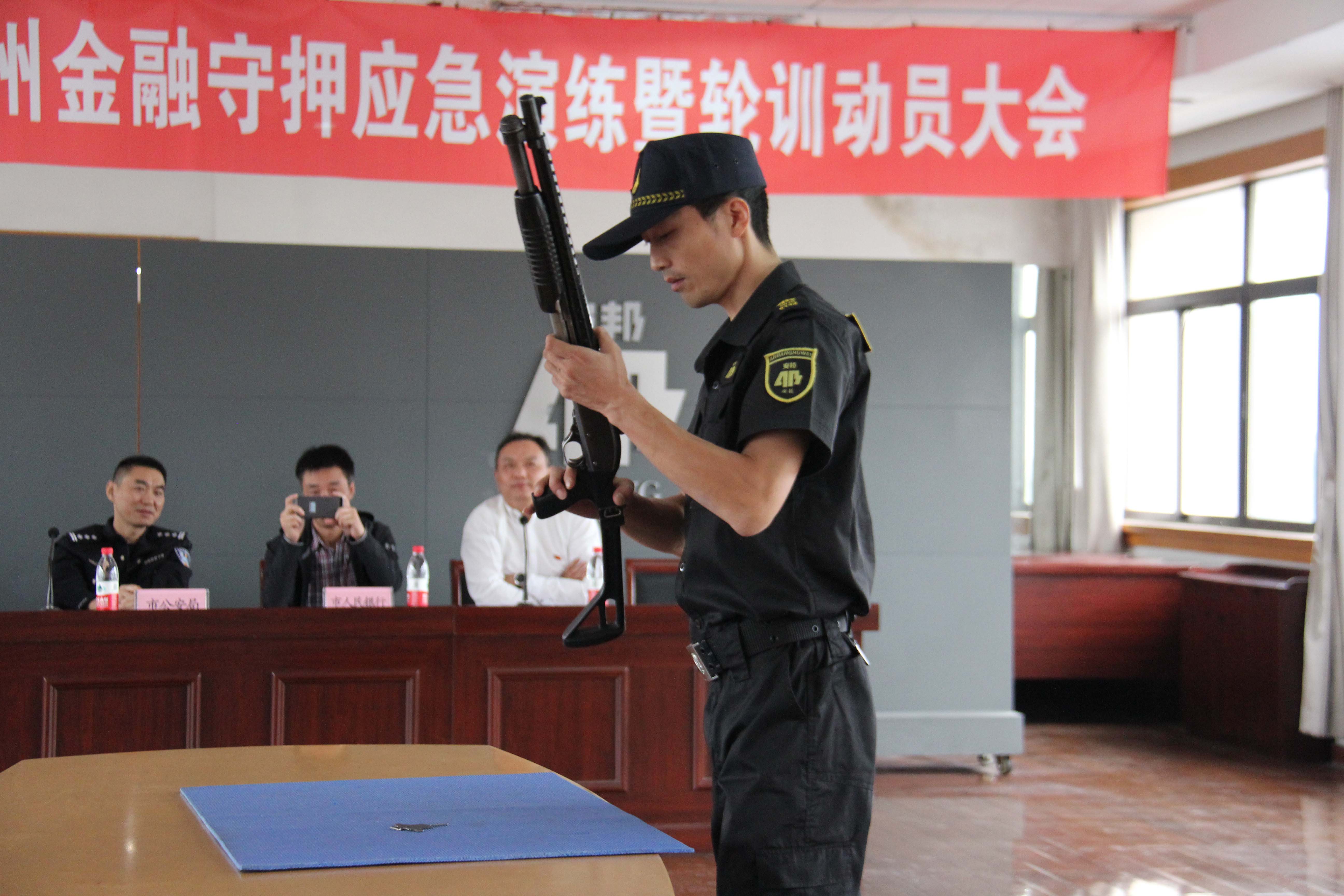 本次演练项目分别有防暴枪分解结合、应急预案桌面推演、押运车天窗逃生演练、钢叉制服歹徒和网点防抢演练5个科目。
