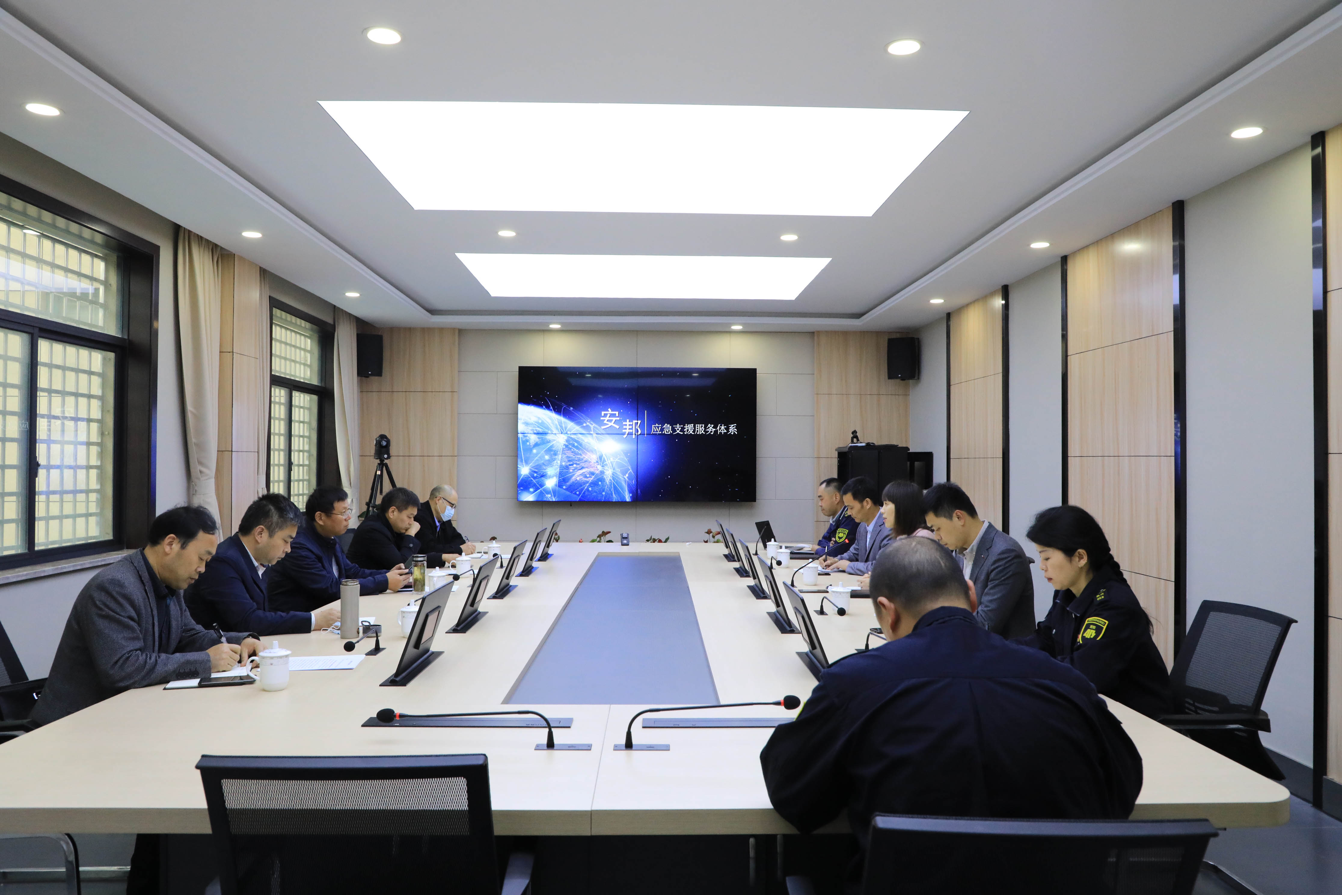 张淑芬汇报了衢州安邦在应急管理事务服务方面的设想。科技防护部详细介绍了安邦应急支援服务体系,并现场演示临时应急指挥平台。