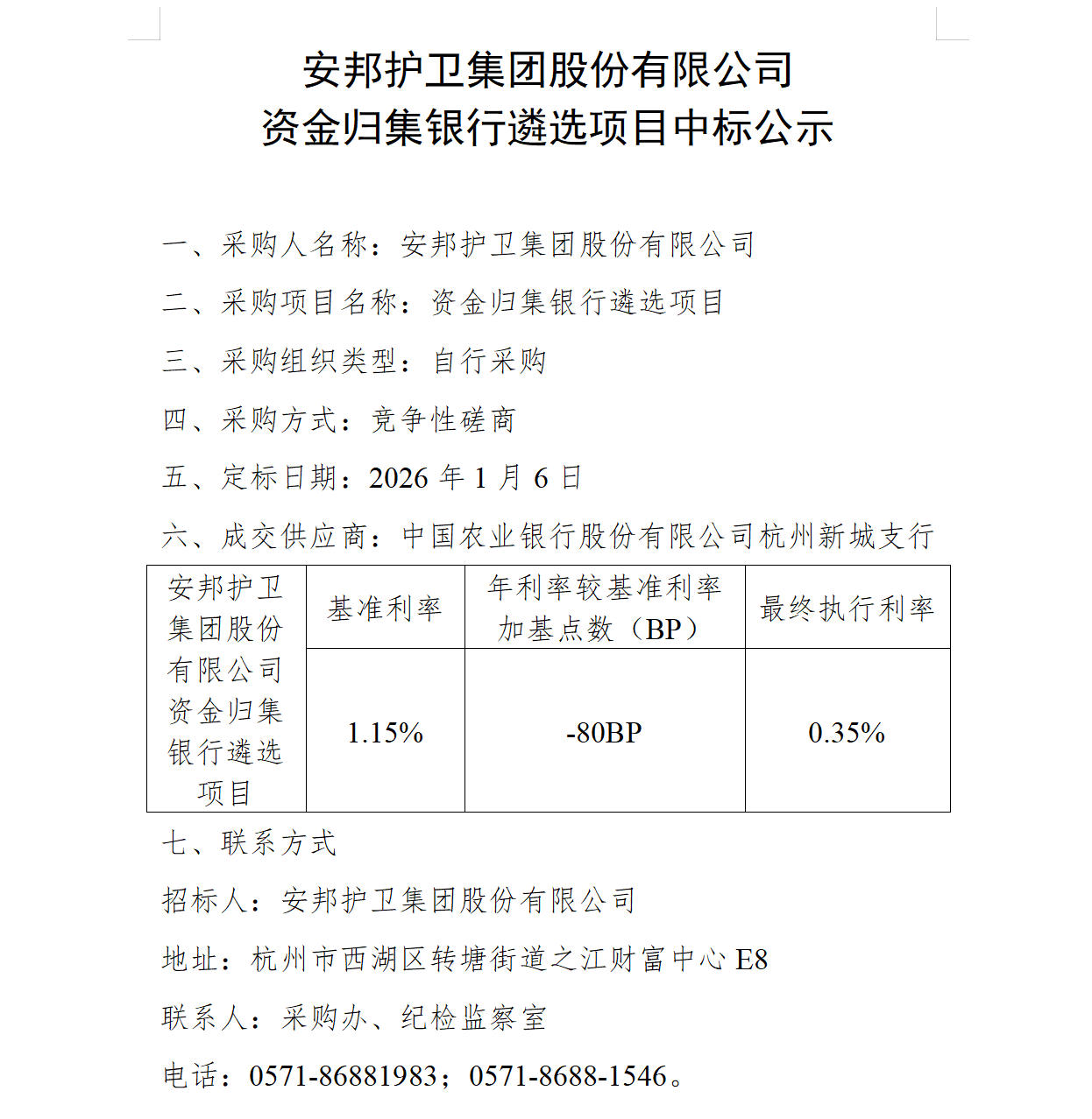 安邦护卫集团股份有限公司资金归集银行遴选项目中标公示