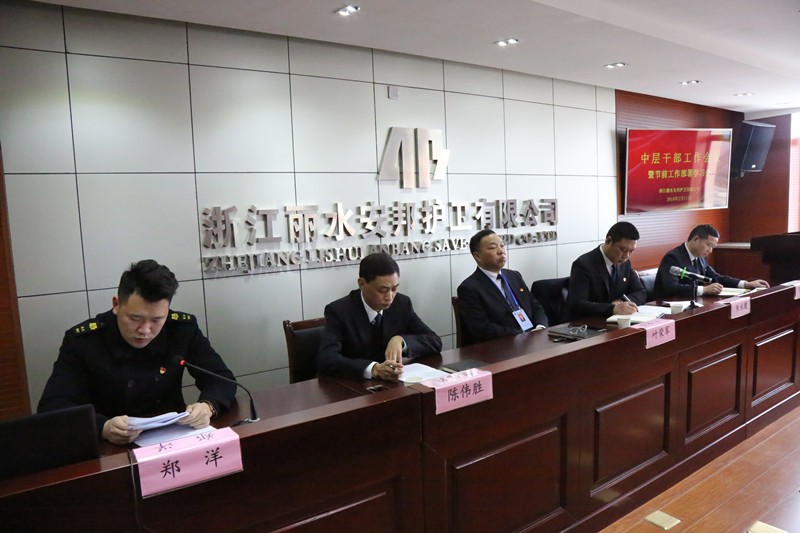 2月11日上午,浙江丽水安邦护卫有限公司党委召开2017年度民主生活会前专题学习会,深入学习领会习近平新时代中国特色社会主义思想,为开好民主生活会打牢思想基础。学习会由公司纪委书记朱永健主持,公司党委书记叶荣军及党委领导班子成员、中层副职以上干部、机关全体员工参加了学习。