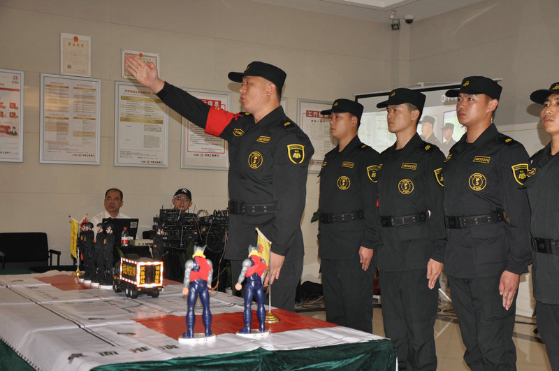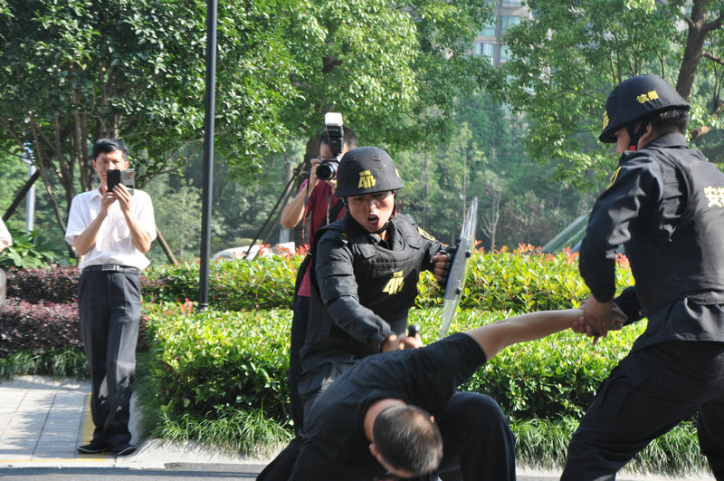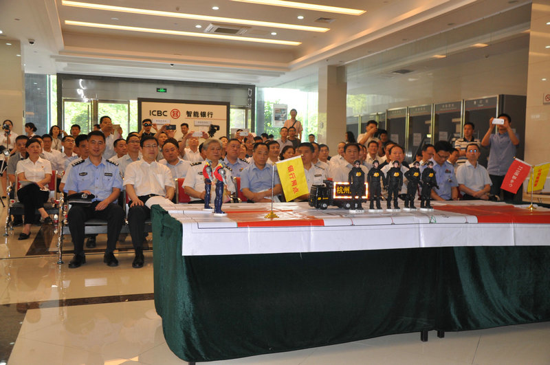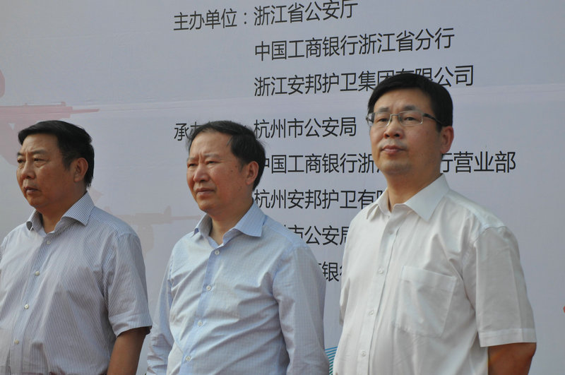 6月14日,由省公安厅、工商银行浙江省分行、浙江安邦护卫集团有限公司主办的浙江省“护航G20-警银企联动”防暴应急演练在工商银行杭州众安支行举行,浙江省公安厅副厅长金伯中、浙江省国资委副主任沈建平以及集团公司董事长吴高峻、总经理诸葛斌等班子成员现场观摩了演练的全过程。