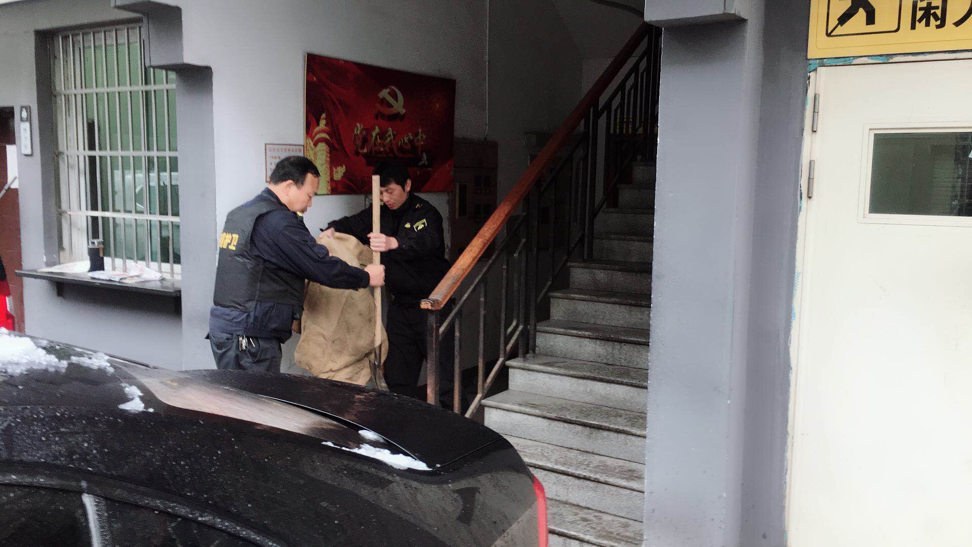 8日晚上,绍兴的雪越飘越大,担心第二天道路结冰会对押运产生影响,公司领导连夜发布通知提醒员工注意天气情况和出行安全,相关部门及时启动应急预案,后勤部门提前准备好各种除雪工具,值班人员随时关注积雪情况。第二天一大早天才刚亮,公司大楼里就有拿着防滑麻袋、扫把、铁锹等各类除雪工具的员工加入了除雪大军,奋力除雪;大队里的许多队员为了不耽误第二天的工作,都提前来到单位,做好相应的准备工作,认真检查车辆,尤其对开往山区的车组,给每个车辆都安装防滑链,排除隐患保障安全。