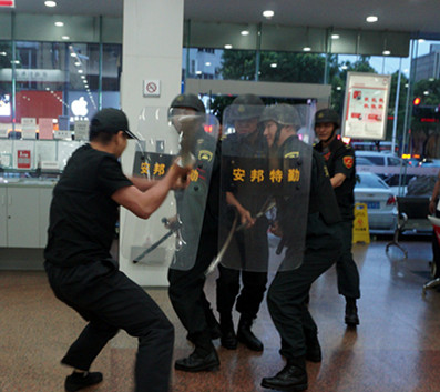 安邦护卫应急小分队接警到达现场后,歹徒见势准备逃跑,两队展开了合围,最终将犯罪嫌疑人制服。