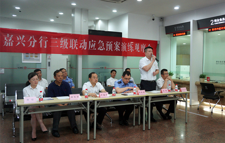 嘉兴安邦护卫县(市)守押大队嘉善队联合工行嘉兴市分行嘉善支行开展ATM机加钞防抢劫应急预案演练