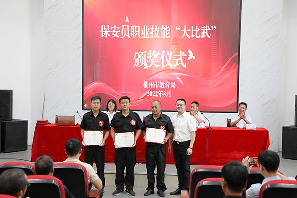 经过紧张激烈的比拼,中午,2022年全市学校保安员职业技能“大比武”举办颁奖仪式。衢州市教育局党委委员、副局长曾金松,市教育局校园安全监管处处长程贵山,衢州市中小学素质教育实践学校党支部书记曾广前为获奖团体和个人颁发荣誉证书,其中由安邦保安公司派驻代表的柯城区教育局获团体第一名,由安邦保安公司派驻的学校保安员卢君忠获得个人第二名。