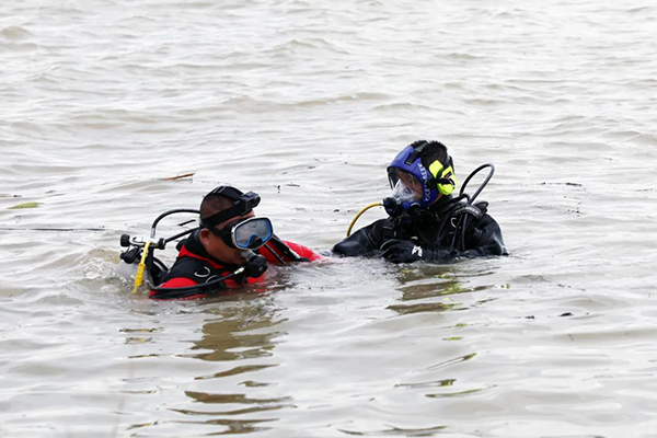 另一边,潜水员与吊车密切协同配合,按照要求数次下水作业后,将落水车辆成功固定于吊车钢索,顺利施救上岸,在小组的共同奋战下,“险情”得以顺利处置。
