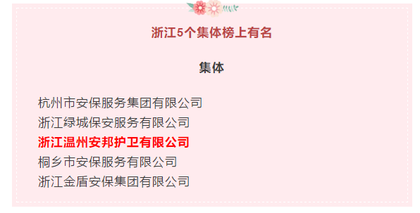 为表扬先进、鼓舞士气,鼓励广大保安企业和保安员争先创优,积极投身常态化疫情防控和维护社会治安各项工作,公安部近日通报表扬保安行业抗击疫情表现突出的105个集体和500名个人,温州安邦护卫荣获“全国抗击疫情表现突出保安集此次通报表扬浙江省共有5家上榜企业。