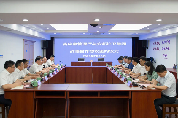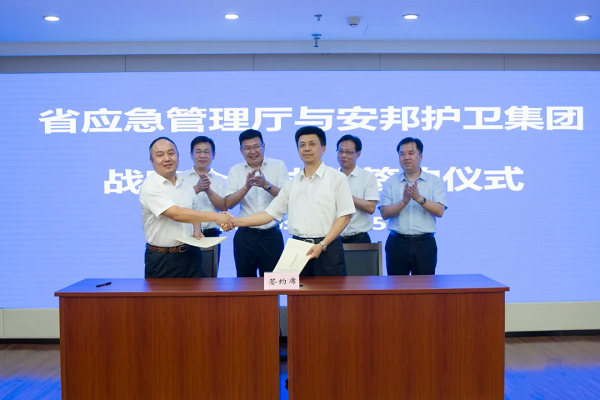 7月15日下午,浙江省应急管理厅和浙江安邦护卫集团有限公司在省行政中心举行战略合作签约仪式。省应急管理厅党委书记、厅长凌志峰,省国资委党委委员、副主任刘盛辉,安邦护卫集团党委书记、董事长吴高峻出席签约仪式并致辞。省应急管理厅党委委员、副厅长钱宏丰与安邦护卫集团党委副书记、总经理诸葛斌代表双方签订战略合作协议。
