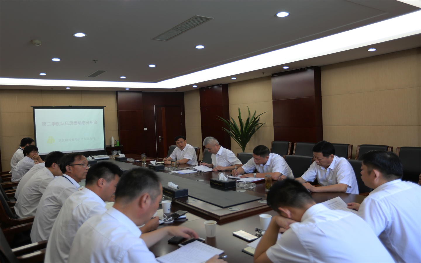 8月7日上午,绍兴安邦公司召开第二季度队伍思想动态分析会,公司党委书记、董事长、总经理胡秀荣,副总经理陈良、王天飞、纪委书记董礼财,三个大队、行政各部门主要负责人参加。
